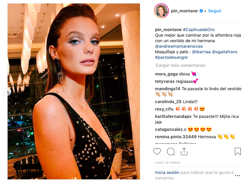 La actriz Josefina Montané, quien es parte del elenco de la teleserie "Pacto de sangre", la gran ganadora del Copihue de oro como "Mejor teleserie" llegó a la alfombra roja del evento luciendo un vestido hecho por su hermana.