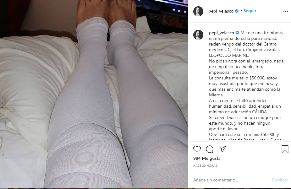 “Me dio una trombosis en mi pierna derecha para Navidad, recién vengo del doctor del Centro Médico UC, en Lira”, partió escribiendo Josefina, para luego hacer su 'funa' contra el profesional.