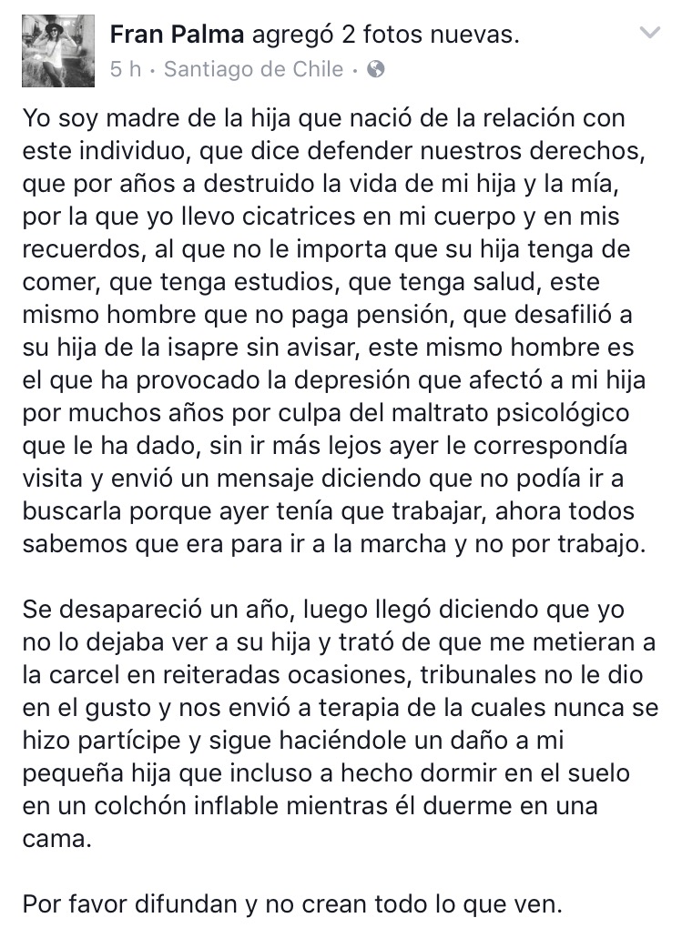 Sin embargo, hace unas horas apareció una historia totalmente opuesta. Según relata el sitio El Desconcierto, una joven llamada Francesca Palma, quien afirma que era la ex pareja del joven y que tienen una hija en común. Ella relata que "por años ha destruido la vida de mi hija y la mía, por la que yo llevo cicatrices en mi cuerpo y en mis recuerdos, al que no le importa que su hija tenga de comer, que tenga estudios, que tenga salud".
