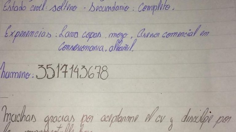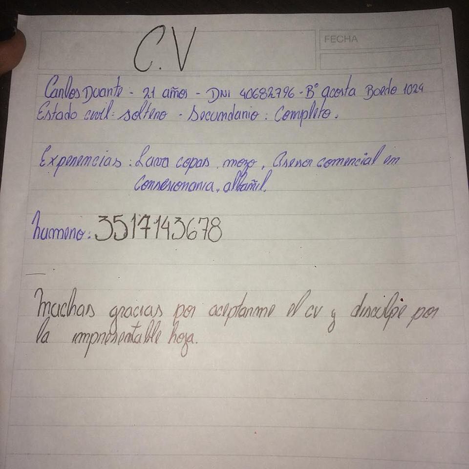 Hace unos días una emotiva carta se tomó las redes sociales. Se trata del currículum a mano que escribió Carlos Duarte, un joven argentino de 21 años que recorrió a pie toda su ciudad en busca de trabajo.