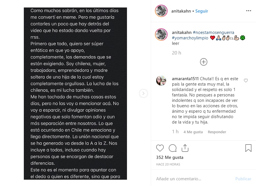 "Apoyo completamente las demandas que se están exigiendo. Soy chilena, mujer, trabajadora, emprendedora, y madre soltera de una hija de la cual estoy completamente orgullosa. La lucha de los chilenos, es mi lucha también", partió señalando.