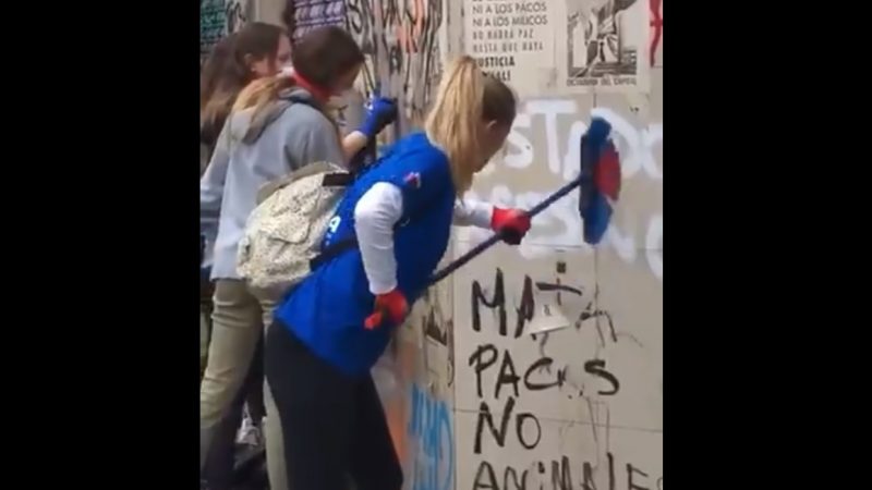 Este fin de semana una joven se volvió inesperadamente viral al salir a limpiar las paredes con rayados tras la masiva marcha en Santiago. En el registro se puede a una mujer rubia con polera azul barriendo enérgicamente la pared, siendo blanco de bromas, memes, críticas y también amenazas.