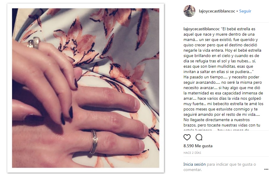 "Ha pasado un tiempo..... y necesito poder seguir avanzando..... no seré la misma pero necesito avanzar.... si hay algo que me dió la maternidad es esa capacidad inmensa de amar.... hace varios días la vida nos golpeó muy fuerte... mi bebecito estrella te amé los pocos meses que estuviste conmigo y te seguiré amando por el resto de mi vida..... No llegaste directamente a nuestros brazos, pero tocaste nuestras vidas con tu estela luminosa..... hoy soy capaz de contarles, ver cada mensaje preguntándome y de tanto amor por mi embarazo... era necesario para mi hacerlo ya que me dolía aún más. Por ahora no tengo más que contar .... Gracias por tanto amor.....Así recordaré estos días con tanto amor y una sonrisa porque tú estabas con nosotros y lo estarás siempre".