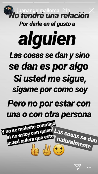 Por esta razón, el artista quiso alzar la voz y defenderse de las críticas a través de su cuenta de Instagram.“No tendré una relación por darle en el gusto a alguien. Las cosas se dan, y si no se dan es por algo. Si usted me sigue sígame por como soy, pero no por estar con una u otra persona”, expresó.