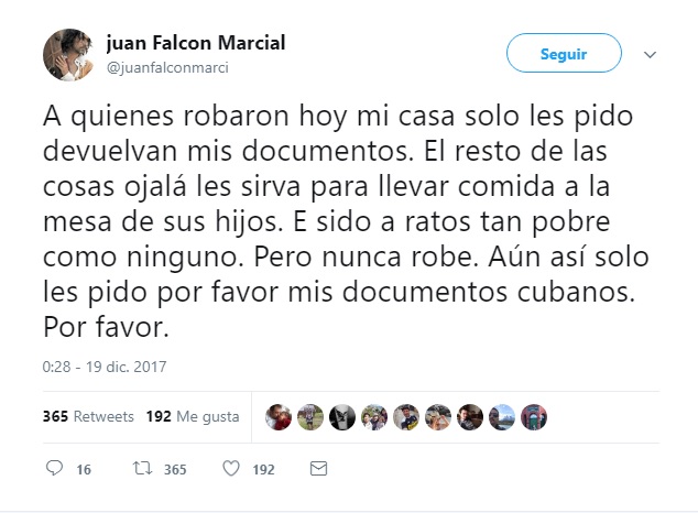 "A quienes robaron hoy mi casa solo les pido devuelvan mis documentos. El resto de las cosas ojalá les sirva para llevar comida a la mesa de sus hijos. He sido a ratos tan pobre como ninguno. Pero nunca robé. Aún así solo les pido por favor mis documentos cubanos. Por favor", escribió Falcón en un llamado desesperado.