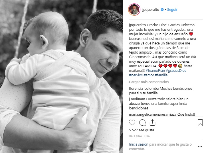"Mañana me someto a una cirugía, ya que hace un tiempo que me aparecieron dos glándulas de 3 cm de tejido adiposo... más conocido como Ginecomastia. Así que mañana será un día muy especial acompañado de quienes amo! Mi familia", escribió Juan Pablo, acompañando el texto de una foto junto a su hijo Amador.