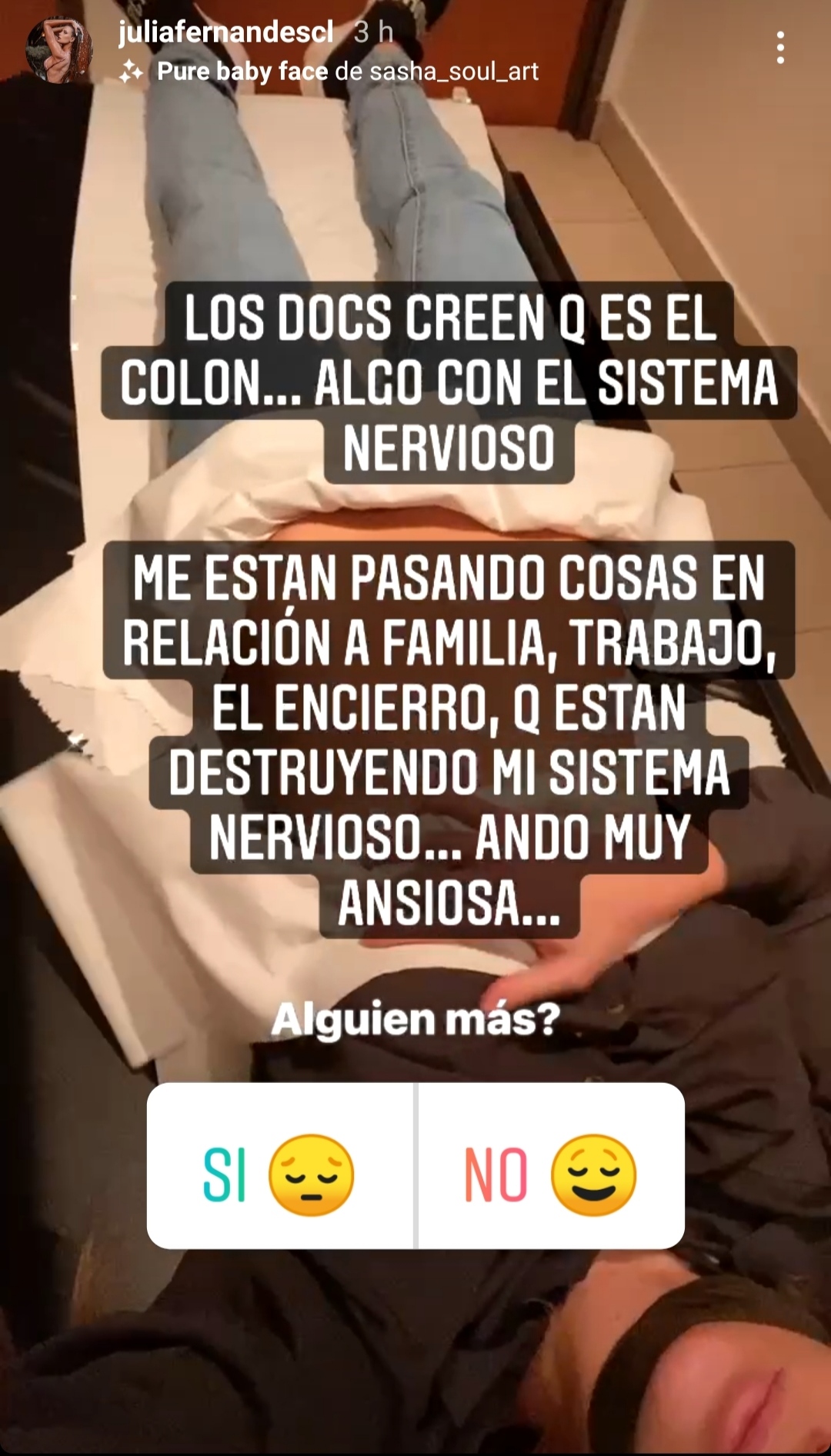 'Los docs creen que es el colon... algo con el sistema nervioso. Me están pasando cosas en relación a familia, trabajo, el encierro que están destruyendo mi sistema nervioso. Ando muy ansiosa', agregó para acompañar otra postal.