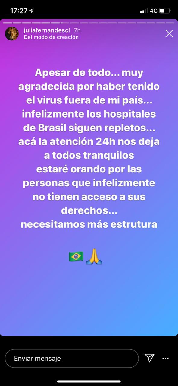 Pese a todo lo malo Julia Fernandes agradeció tener los medios y cuidados para tratar la enfermedad. Ya que a diferencia de donde se encuentra, en Brasil los hospitales están llenos y colapsados.