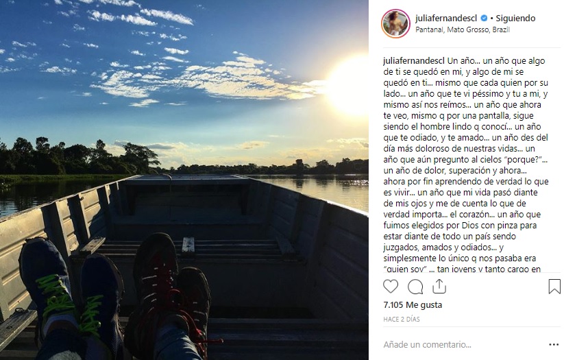 "Un año... un año que algo de ti se quedó en mí y algo de mí se quedó en ti... mismo que cada quien por su lado... un año que te vi pésimo y tu a mí, y mismo así nos reímos... un año que ahora te veo, mismo que por una pantalla sigues siendo el hombre lindo que conocí... un año que te he odiado y te amado... un año desde el día más doloroso de nuestras vidas... un año que aún pregunto al cielo “¿por qué?”", comienza el relato de la brasileña.