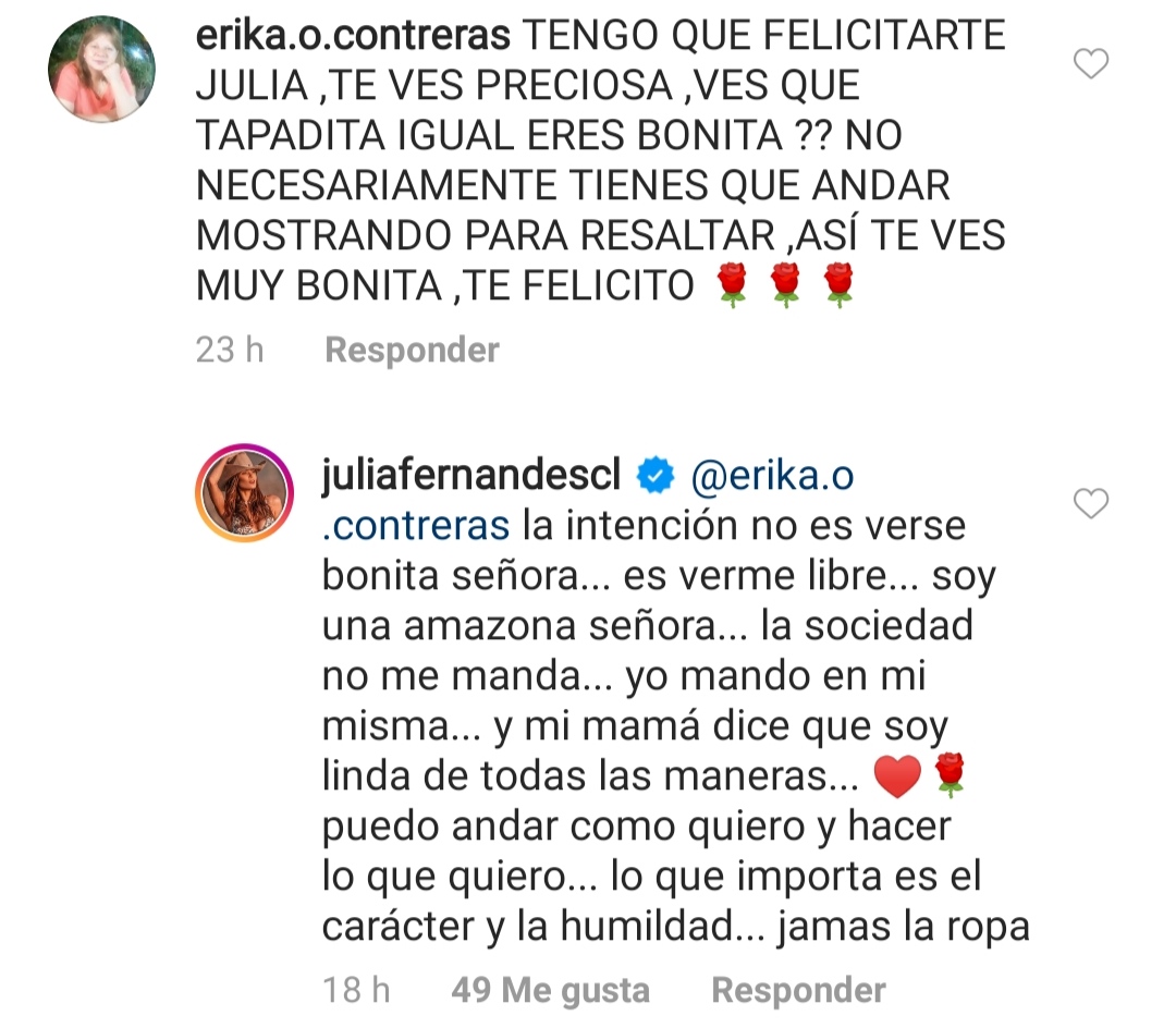 'Tengo que felicitarte Julia. Te ves preciosa, ves que tapadita igual eres bonita? No necesariamente tienes que andar mostrando para resaltar. Así te ves muy bonita, te felicito', le escribió una usuaria de Instagram.