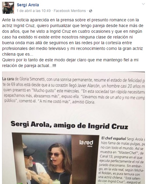 "He visto a Ingrid Cruz en cuatro ocasiones y que en ningún caso ha existido ni existe entre nosotros ninguna clase de relación ni buena onda mas allá de seguirnos en las redes por la cortesía entre profesionales del medio televisivo y mi reconocimiento como la gran actriz chilena que es. Quiero por lo tanto de este modo dejar claro que me mantengo fiel a mi relación de pareja actual", añadió.