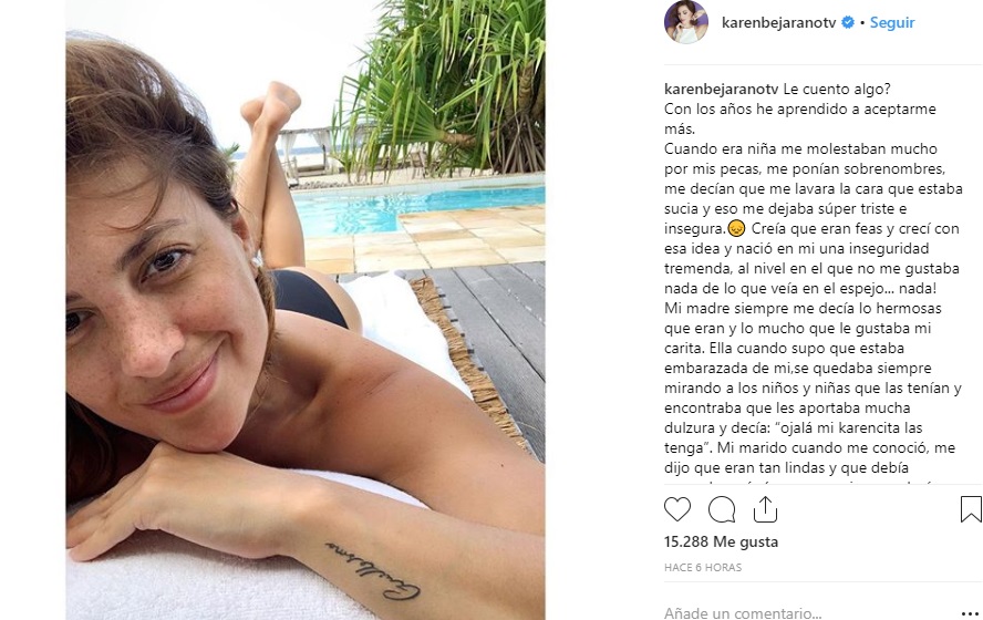 Con una selfie mostrando su cara deslavada con sus pecas en el rostro orgullosamente, Karen reveló que fueron varios años tratando de aceptarse debido a las constantes bromas durante el colegio por tener gran cantidad de pecas en el rostro.