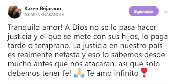 Así mismo, Karen Bejarano también tuvo palabras para Juan Pedro, recalcando su fe en que la justicia llegará tarde o temprano.