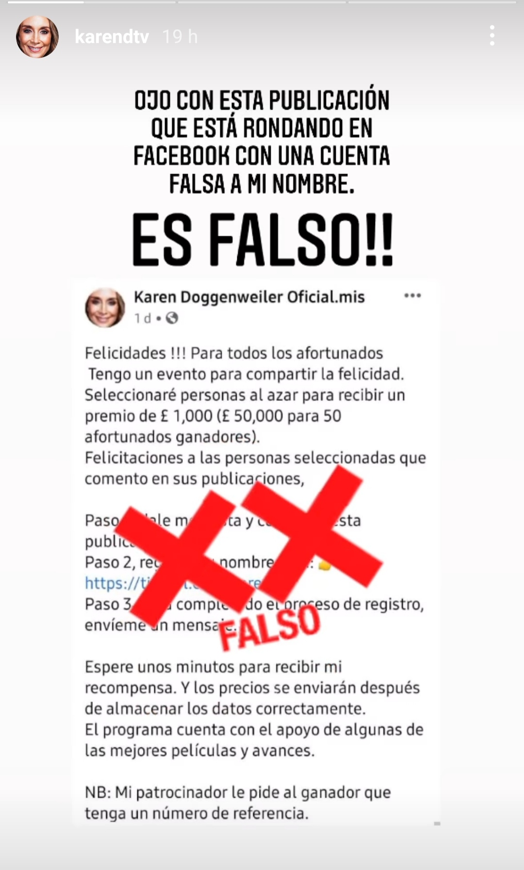 'Para todos los afortunados. Tengo un evento para compartir la felicidad. Seleccionaré personas al azar para recibir un premio de mil libras esterlinas y 50 mil para los primeros 50 afortunados ganadores. Felicitaciones a las personas seleccionadas que comento en sus publicaciones', se lee en el mensaje.