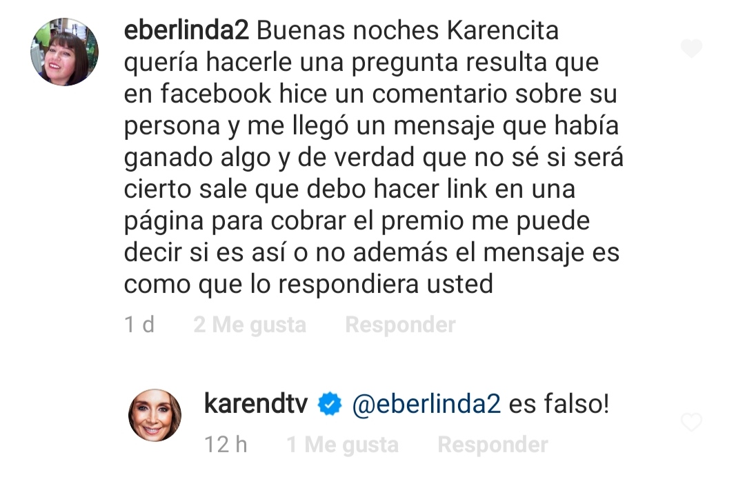 Pero la situación es más grave aún, porque Karen no solo está siendo víctima de usurpación de identidad, sino que además están intentando realizar estafas con su nombre.