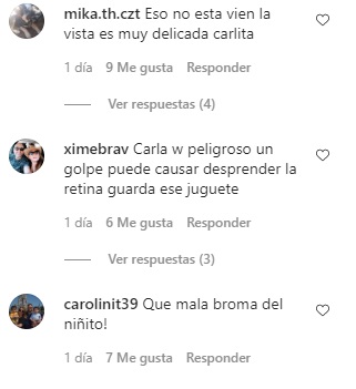 "¿Cómo se te ocurre publicar eso? y figura pública que queda para el resto😱", "Karla es peligroso un golpe, puede causar desprender la retina, guarda ese juguete", "Con los ojos no se juegan, cuídalos" y "Qué mala broma", fueron algunos mensajes que recibió la publicación de la conductora.