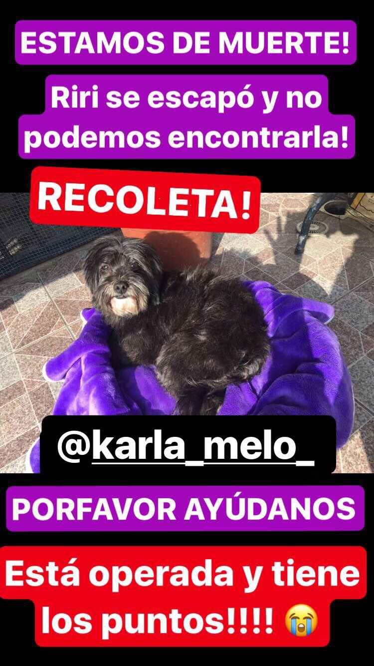 “Por favor gente de Recoleta y sus alrededores ayúdennos a encontrar a Riri❤ ¡La recogimos hace 7 días y hoy se escapó! Está recién operada, tiene muchos puntos en su guatita y tiene que tomar sus medicamentos. Andaba con una fajita color azul marino. Tiene una patita pelada por la vía que le pusieron en la operación. Si sus dueños la encontraron por favor avísenme o si alguien la acogió, también”, escribió este martes la actriz de 30 años, agregando que nunca se le había escapado un perrito y que la situación es muy terrible.