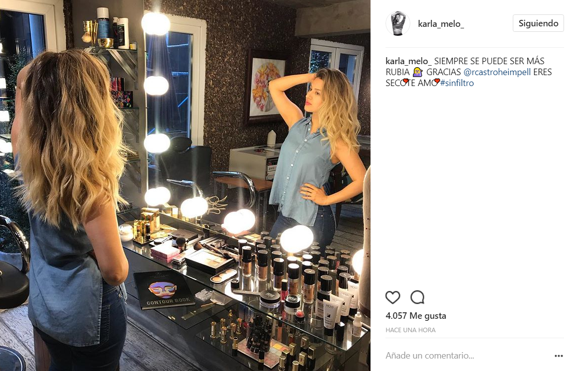 Karla, parte del actual elenco de “Tranquilo papá”, quien interpreta a “Natu” Flores en la teleserie, compartió a través de Instagram esta noticia y escribió: “Siempre se puede ser más rubia. Gracias @rcastroheimpell eres seco, te amo #sinfiltro”. La fotografía se llenó de elogios destacando lo bien que se veía con su nuevo color de pelo que le aporta mucha frescura para esta época.