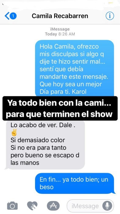 Sin embargo, ambos jóvenes decidieron dar fin a esta supuesta "pelea" y a través de un mensaje Karol le pidió disculpas a Camila por si algo la había hecho sentir mal.
