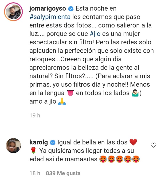 Una de las personas que no tardó en responder fue precisamente Karol G, quien destacó la belleza de la artista en ambas fotografías. "Ya quisiéramos llegar todas a su edad así de mamasitas", comentó, sacando aplausos en la red social.