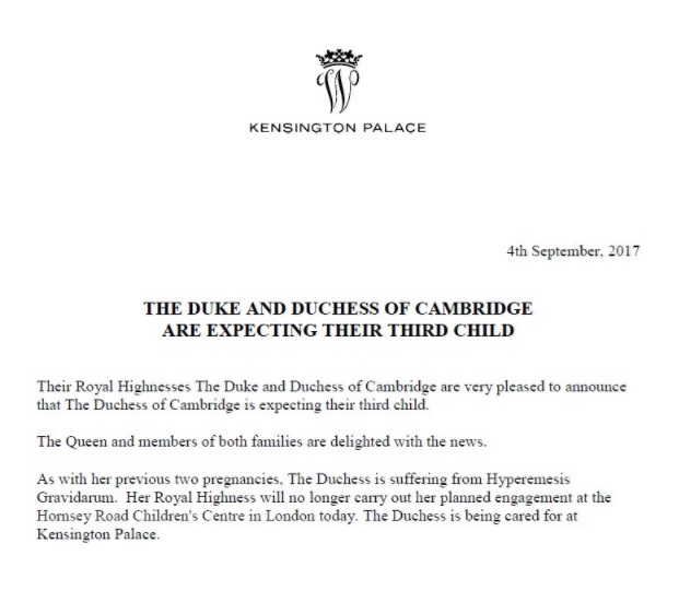 “Sus altezas reales el duque y la duquesa de Cambridge están felices de anunciar que la duquesa de Cambridge está esperando su tercer hijo. La reina y los miembros de ambas familias están felices con esta noticia”.