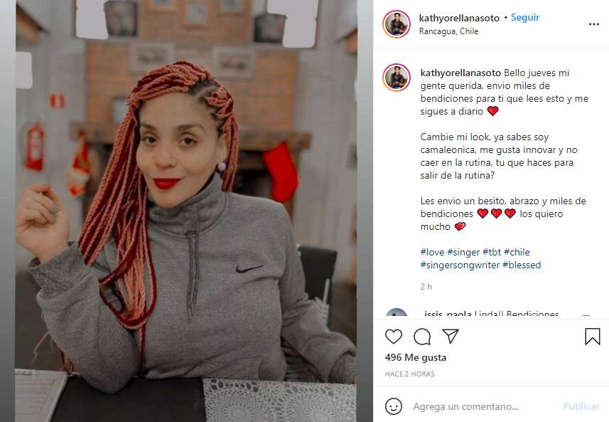 Y es que en la foto que compartió en su cuenta de Instagram, aparece con unas trenzas de colores rojos y anaranjados y, además aprovechó de enviar "un besito, abrazo y miles de bendiciones los quiero mucho".