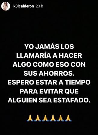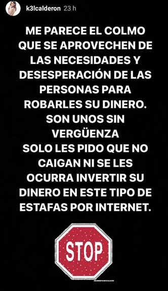 «Me parece el colmo que se aprovechen de las necesidades y la desesperación de las personas para robarles su dinero. Son unos sinvergüenzas. Solo les pido que no caigan ni se les ocurra invertir su dinero en este tipo de estafas por internet», señaló Kel en otra de sus publicaciones.