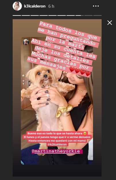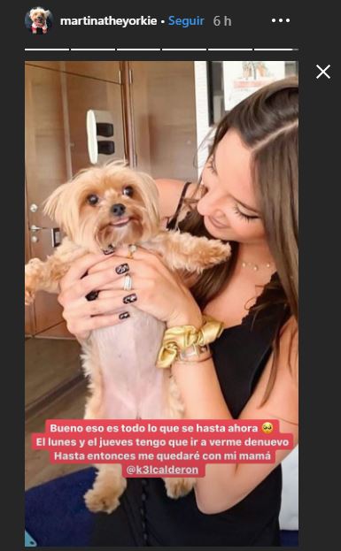 Ante la preocupación de sus seguidores, la influencer luego escribió en su Instagram que: "Para todoss los que me han preguntado por la Marti, ahí en su cuenta les dejé los detalles. Muchas gracias por sus mensajes". Tras esto, compartió varias historias en la cuenta de su perrita para contar su estado actual.