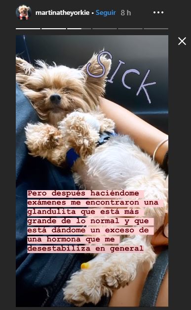 Y ahora último, contó a través de la cuenta de Instagram de su mascota (@martinatheyorkie) que posiblemente será operada.