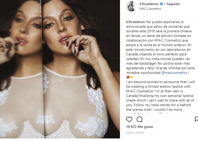 "No puedo explicarles lo emocionada que estoy de contarles que durante este 2018 seré la primera chilena en lanzar un labial de edición limitada en colaboración con M∙A∙C Cosmetics que estará a la venta en el mundo entero!! En este minuto estoy en sus laboratorios en Canadá creando el tono perfecto para ustedes! En mis insta-stories pueden ver más del backstage! No podría estar más agradecida y feliz! Gracias infinitas por esta increíble oportunidad @maccosmetics !