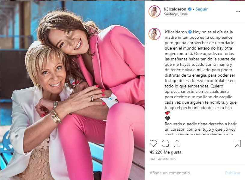 "Quiero aprovechar este viernes cualquiera para decirte que me lleno de orgullo cada vez que alguien te nombra. Y que tengo el pecho inflado de ser tu hija. Recuerda que nadie tiene derecho a herir un corazón como el tuyo y que yo voy a estar siempre siempre siempre a tu lado. Te adoro mamá", concluyó.