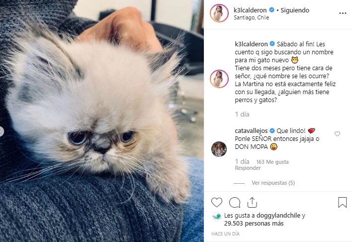 "Les cuento que sigo buscando un nombre para mi gato nuevo 🐱Tiene dos meses, pero tiene cara de señor, ¿qué nombre se les ocurre? La Martina no está exactamente feliz con su llegada, ¿alguien más tiene perros y gatos?", escribió Kel Calderón.