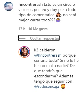 Kel no quedó indiferente a este comentario y le respondió: "Porque cerraría todo? ¿Si no le he hecho mal a nadie? ¿De que tendría que esconderme? Además tengo que seguir con @redesencaja (la organización que encabeza)”.