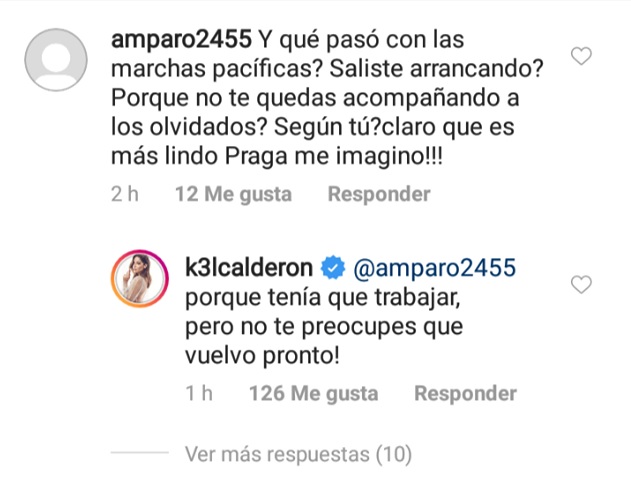 En particular, una usuaria la críticó por su "poco compromiso" con las manifestaciones en Chile. "Y qué pasó con las marchas pacíficas? Saliste arrancando? Porque no te quedas acompañando a los olvidados? Según tú? Claro que es más lindo Praga me imagino!!!", le escribió.