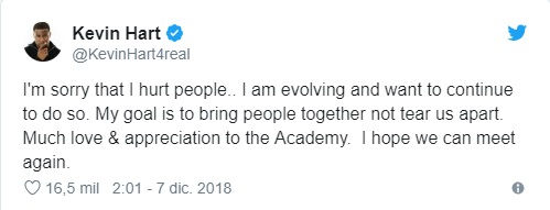 "He tomado la decisión de renunciar a presentar los Oscar, porque no quiero ser una distracción en una noche que debería ser celebrada por tantos artistas talentosos e increíbles. Pido perdón sinceramente a la comunidad LGBTQ por mis contenidos insensibles del pasado", escribió Hart en Twitter.