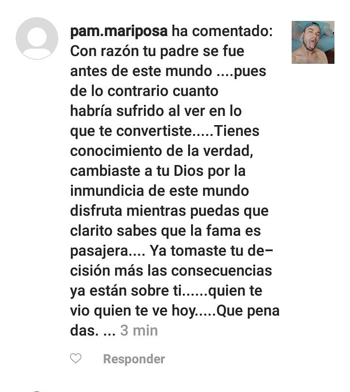 El cantante y defensor de los derechos lgbt compartió estas ofensivas palabras con una reflexión donde parte diciendo: ¿Por qué esta persona cree que puede hablar en nombre de mi viejo si él ya no está?. Para su información mi papá era el que me compraba las muñecas y el maquillaje etc. Jamás sentí rechazo ni de él ni de mi madre a pesar de que íbamos a la iglesia".