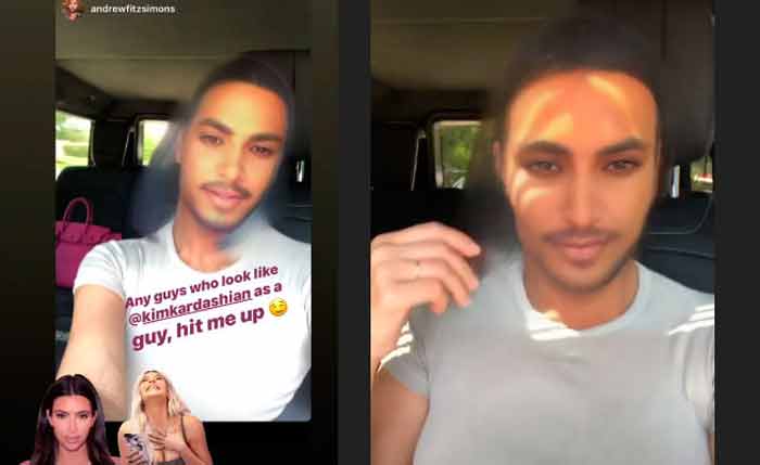 La versión masculina de Kim le sumó a su bello rostro una barba y bigote de una semana, además de unas tupidas cejas, lo que cambió totalmente su apariencia. Pese a que sus labios carnosos no fueron retocados.