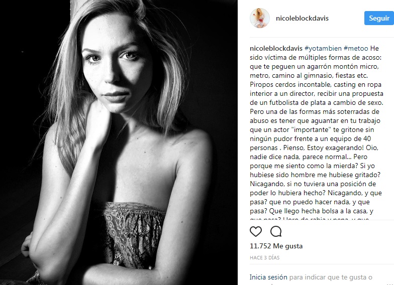 Asimismo, la actriz revela que: "Una de las formas más soterradas de abuso es tener que aguantar en tu trabajo que un actor "importante" te gritone sin ningún pudor frente a un equipo de 40 personas . Pienso, Estoy exagerando! Oio, nadie dice nada, parece normal... Pero porque me siento como la mierda? Si yo hubiese sido hombre me hubiese gritado? Nicagando, si no tuviera una posición de poder lo hubiera hecho? Nicagando, y que pasa? que no puedo hacer nada, y que pasa? Que llego hecha bolsa a la casa, y que pasa? Lloro de rabia y pena, y que pasa? a nadie le importa nada".
