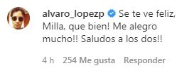 "Por más hombres como tú"; "No puedes ser más lindo", le comentaron a López, mientras que la misma Millaray también le agradeció la buena onda. "Awww, gracias Lopecillo. Te quiero mucho", le respondió.