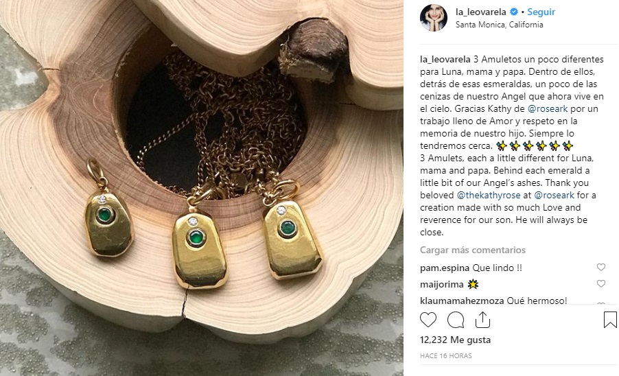 “3 amuletos un poco diferentes para Luna, mamá y papá. Dentro de ellos, detrás de esas esmeraldas, (hay) un poco de las cenizas de nuestro ángel que ahora vive en el cielo”, escribió junto a la postal.