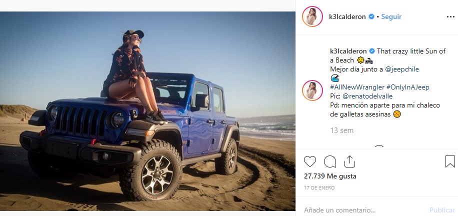 De hecho, en una de las últimas fotos para la marca, la influencer aparece posando sobre el capó de un jeep del mismo color, con un envidiable paisaje de fondo. Y al parecer esta fue la inspiración de su madre para una de sus últimas publicaciones.