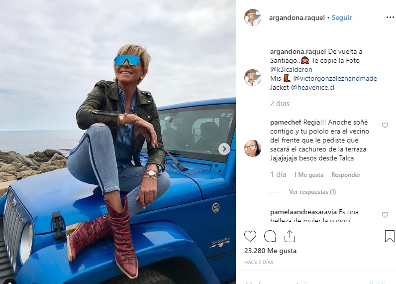“De vuelta a Santiago… te copié la foto Kel Calderón”, escribió Raquel junto a la postal, donde se le ve sentada en un jeep azul, tal como su hija Kel en varias ocasiones, ya que es embajadora de una marca de autos.
