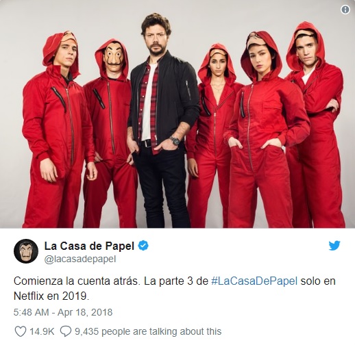 "Tendremos una ficción que conectará a Berlín, Nairobi, Moscú, Tokio... ¿sabes de que hablo? Netflix producirá una tercera temporada de “La casa de papel” y podrá verse en 2019. Ya estamos trabajando con Álex Pina en ello", señaló.