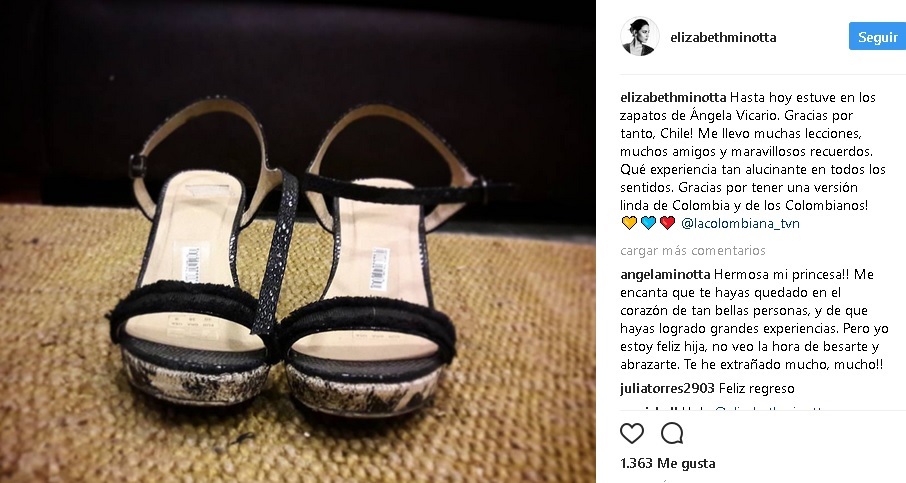 “Hasta hoy estuve en los zapatos de Ángela Vicario. ¡Gracias por tanto, Chile! Me llevo muchas lecciones, muchos amigos y maravillosos recuerdos. Qué experiencia tan alucinante en todos los sentidos. ¡Gracias por tener una versión linda de Colombia y de los colombianos!”, escribió la actriz en su cuenta de Instagram, acompañando la publicación con una imagen de los zapatos que utilizó en la teleserie.