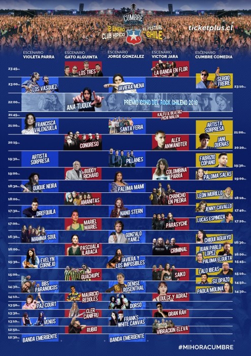 El próximo 12 de enero se llevará a cabo la sexta edición de La Cumbre, evento que reúne lo más destacado de la música chilena y que este año tendrá por primera vez un escenario para comediantes.