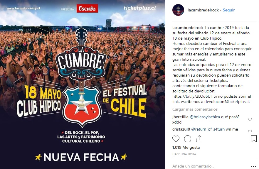 Triste noticia fue la que dieron los organizados de La Cumbre para quienes ya tenían su entrada lista para asistir al festival este 12 de enero en el Club Hípico, ya que el evento se pospone hasta el próximo 18 de mayo.