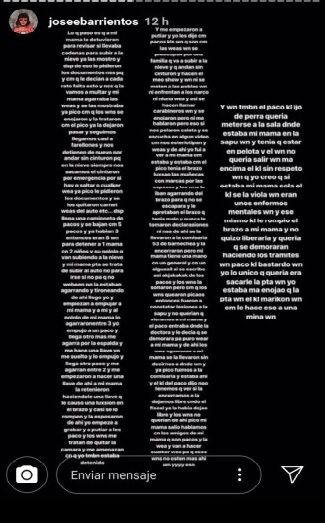 El joven explicó que para ese entonces su mamá ya tenía el codo luxado y marcas en sus muñecas, aún así, aseguró que los uniformados le apretaron el brazo que tenía malo. "Se la llevaron a la comisaría 53 de Barnechea, pero mi mamá tiene una mano con un general y la soltaron", detalló.