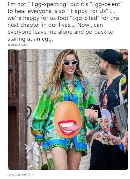"No estoy embarazada, pero es excelente saber que todo el mundo está feliz 'por nosotros'. ¡Nosotros también estamos felices por nosotros! Emocionados por este nuevo capítulo en nuestras vidas", ha dicho Cyrus antes de concluir: "Y ahora podéis dejarme en paz y volver a prestarle atención a un huevo", escribió Cyrus junto a un divertido meme.
