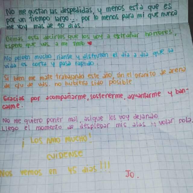 María José escribió: "No me gustan las despedidas, y menos esta que es por un tiempo largo...por lo menos para mí que nunca me voy más de 10 días. "De más está decirles que los voy a extrañar horrores, espero que vos a mi también".