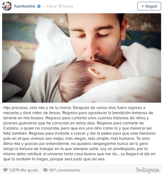 A través de su cuenta de Instagram, fuentes escribió: "Hija preciosa, vida mía y de tu mamá. Después de varios días fuera regreso a mecerte y daré miles de besos. Regreso para agradecer la bendición inmensa de tenerte en mis brazos. Regreso para contarte unas cuantas historias de niños y jóvenes guerreros que he conocido en estos días. Regreso para contarte de Catalina, a quien no conociste, pero que era una niña como tú y que merecía ser feliz también. Regreso para invitarte a crecer y dar la pelea para que este hermoso país en el que vivimos sea mejor, más alegre, más simple, más humano. Te amo Alma mía y gracias por entenderme, no quisiera despegarme nunca de ti, pero tengo la fortuna de trabajar en la que siempre soñé, soy un privilegiado, por lo mismo debo retribuir al universo tanta cosa buena que me da... ya llegará el día en que tú también lo hagas, porque será justo que así sea.